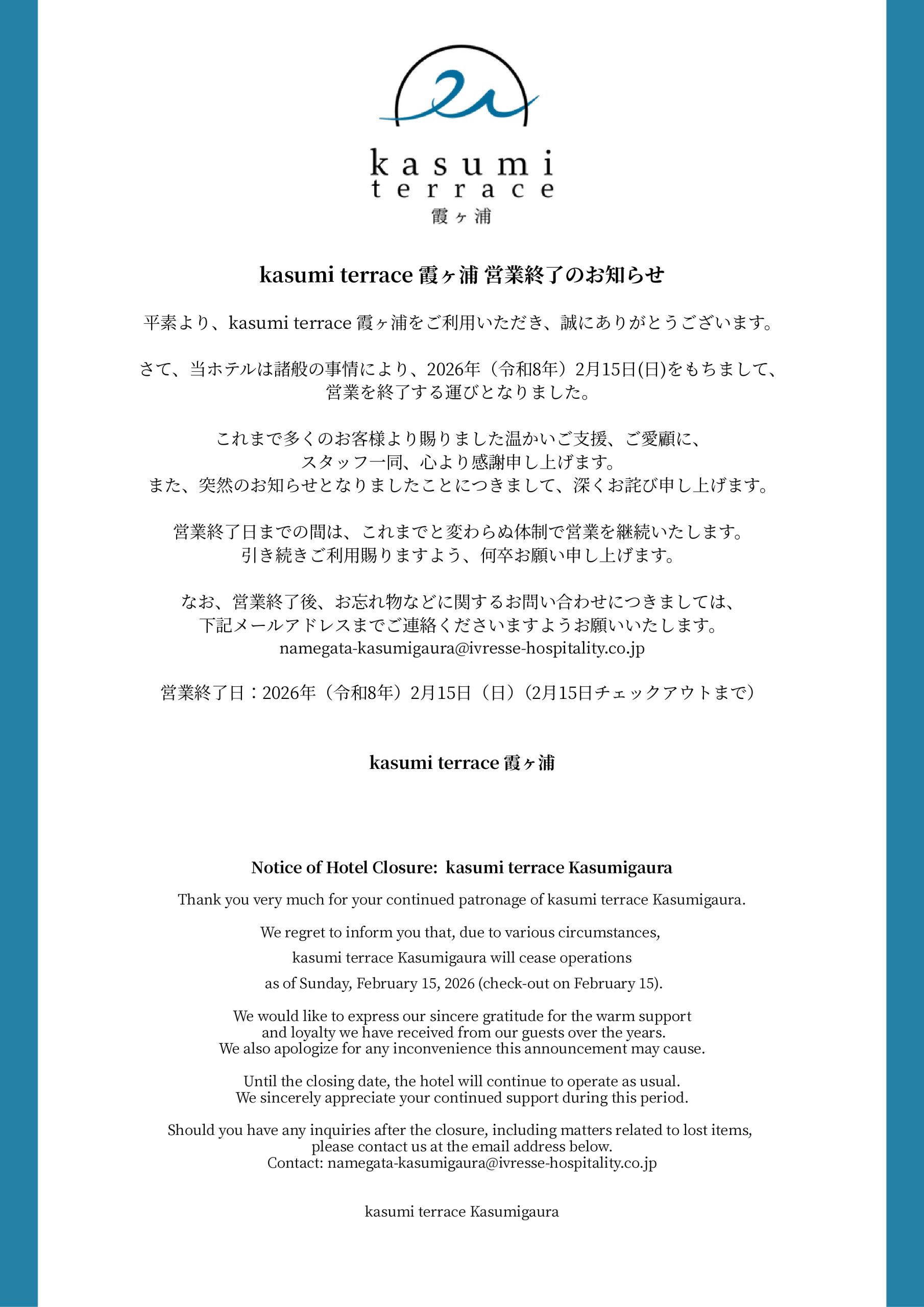 kasumi terrace 霞ヶ浦 営業終了のお知らせ